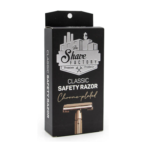 The Shaving Factory Double Edge Safety Razor features a computer designed perfect angle that provides a closer, more comfortable, smoother shave. Fits all double edge blades. Constructed of refined stainless steel, zinc alloy, copper, and ABS. Non-slip grip handles for a secure grip while shaving.